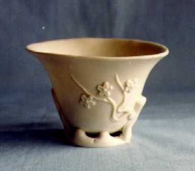 Cup with applied decoration of plum branch on one side and magnolia branch on the other in Te-hua or blanc-de-chine porcelain, a classic form with classic decoration. Ca. 1700-1750.
