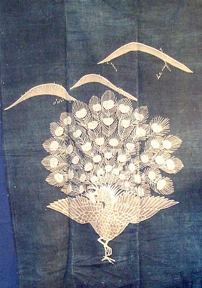cover for child with peacock and mountains An unusual design, which seems to undoubtedly be a peacock, although the ends of the tail feathers resemble those of the phoenix as traditionally depicted. He stands on one foot in chaarming indecision, looking at us from one eye. In the background, three mountain tops are suggested, with dots indicating moss. The tail feathers are drawn with special fineness and care; see detail below. Dimensions about 38" x 59" on three panels of traditional loom width. The background (which is evenly colored) has faded to a soft and tweedy medium blue, with the drawn design in tones of reds, tans, and gray. |