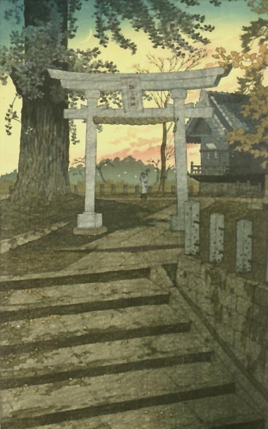 | This beautiful image, of the darkening sky revealing a slender crescent moon over the stone gate of a shrine, is identified by several names. The pencil title in English is Sunset, while the Japanese title in the left margin reads, approximately, Evening Sky, Nippori, Suwa Shrine. | |